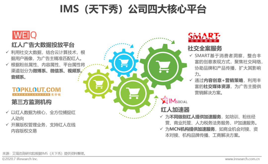 目前,IMS(天下秀)已经构建了一个稳定的“红人经济生态圈”,通过自身平台协同合作,形成了红人经济运转的“齿轮”。通过SMART、WEIQ、克劳锐TOPKLOUT、IMsocial四大业务平台的相互合作、彼此赋能,共同构建出IMS(天下秀)的红人经济新型基础设施服务商业生态。
