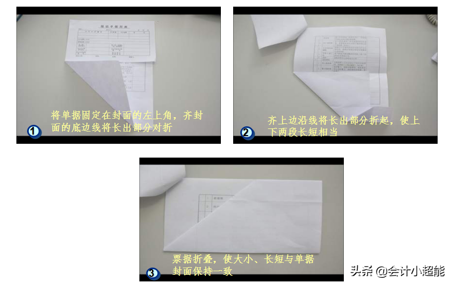 将票据折叠,使大小、长短与单据封面保持一致