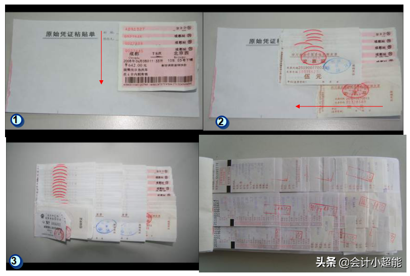 三张及更多:在空白报销单上将原始凭证(原始凭证大部分是发票) 按小票在下、 大票在上 的要求,从右至左 呈阶梯状依次粘贴