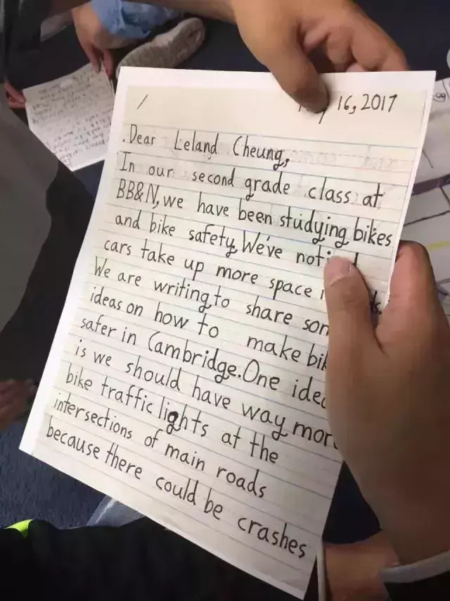 在社会学课上(social study),老师带着孩子们骑着自行车去剑桥市的小区街道,实际观察路上的交通状况,之后再根据大家的观察,分小组进行讨论,共同商讨制作如何改进街道设计的建设蓝图,并把自己的想法梳理出来,写了一封给剑桥市长的信。