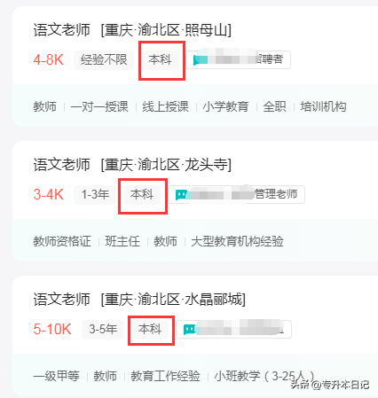 教育专业的同学应该深有体会,现在随便一个小学、初中招聘各科目老师,最低学历要求都是本科。尤其是公办学校基本都是事业单位招聘,报考的最低门槛就是全日制本科。并不是说你的能力出众,经验丰富就可以“例外”,这是硬性的报考条件。