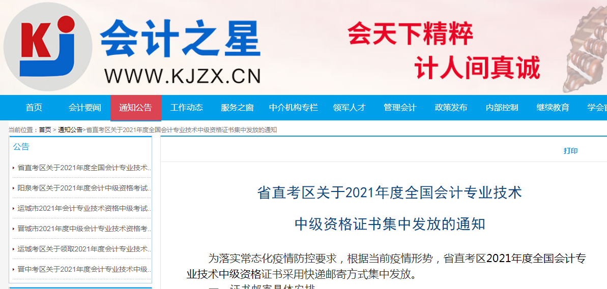 为落实常态化疫情防控要求,根据当前疫情形势,省直考区2021年度全国会计专业技术中级资格证书采用快递邮寄方式集中发放。