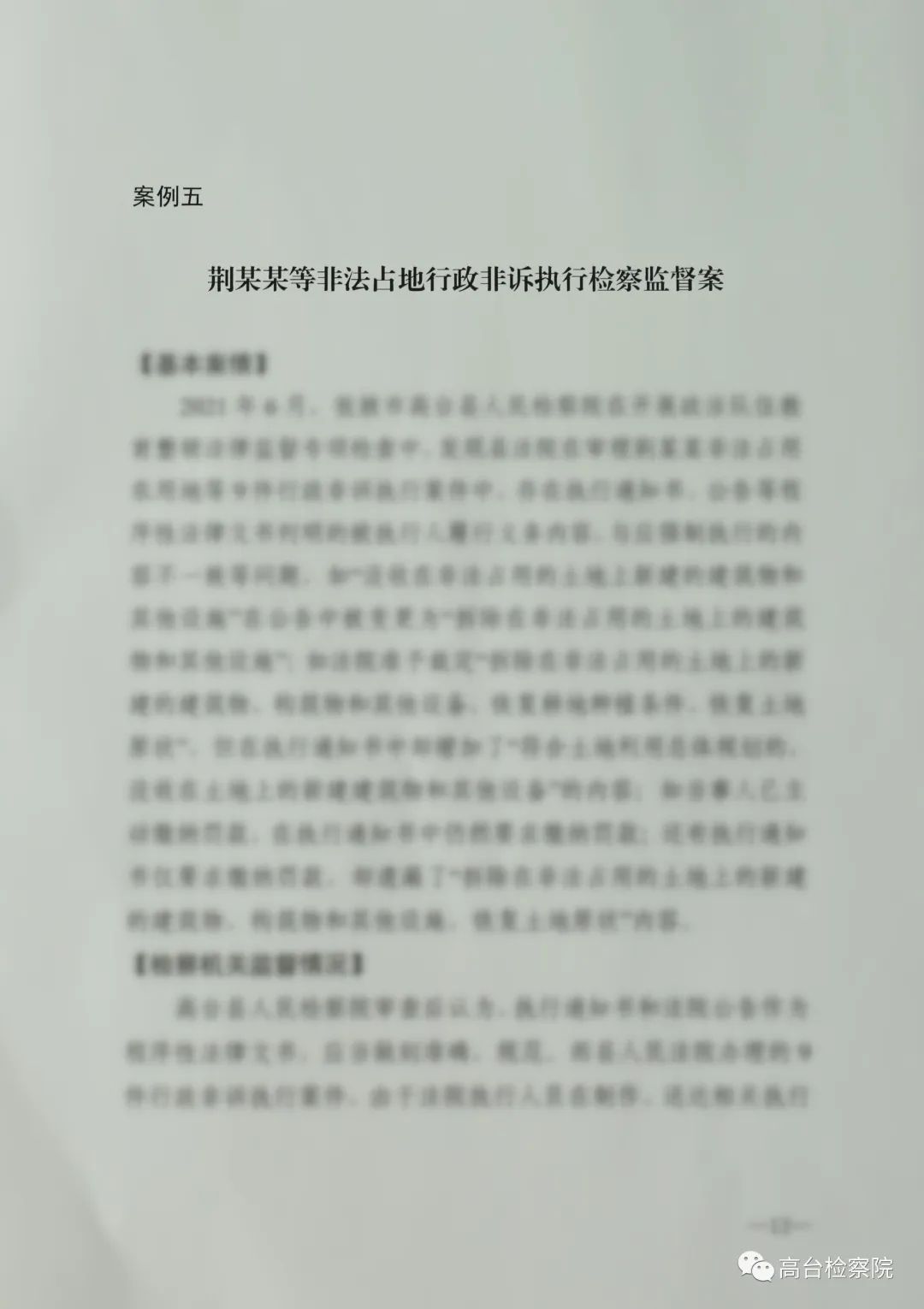 近日,高台县检察院办理的荆某某等非法占地行政非诉执行检察监督案,被省检察院评为全省行政检察优秀案例,系省检察院发布的2021年度行政检察8件优秀案例之一。这是高台县检察院近三年被省检察院采纳的5件行政检察典型案例之后,办理的又一优质案件。