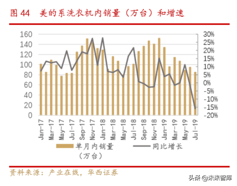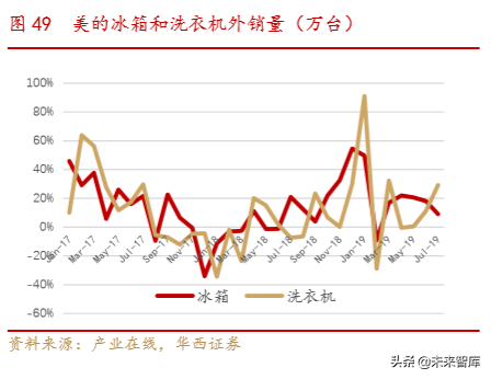 小家电成长性高,美的凭借供应链优势及运营优势有望享受成长红利。虽然传 统小家电品类经历了行业成长期后增速开始放缓(如豆浆机),但小家电产品更新迭 代速度快,新品类处于导入期增速较快,且市场未有明显的竞争格局,因此能否抓住 新品类的成长期,取决于公司是否拥有对市场的快速反应能力及优秀的研发生产设计 能力和供应链能力。美的在产业链上下游具有明显优势,新品研发能力强,并且美的 能够将厨电、清洁电器、小家电等产品运作成为市占率领先的产品,体现了美的强大 的产品运营能力,因此美的在已有小家电领域有望巩固优势获得持续市占率的提升, 同时开发新品享受成长红利。根据奥维云网的数据,美的电饭煲、电压力锅、微波炉、 净水机、电风扇、电热水器、燃气热水器、饮水机、电磁炉品类在 2019 年上半年线 上市场排名第一,洗衣机、冰箱和燃气灶在 2019 年上半年线上市场排名第二。而 2019H1 线下市场中电饭煲、电压力锅、电风扇、料理机排名第一,洗衣机、冰箱、 微波炉、净水机市占率排名第二。