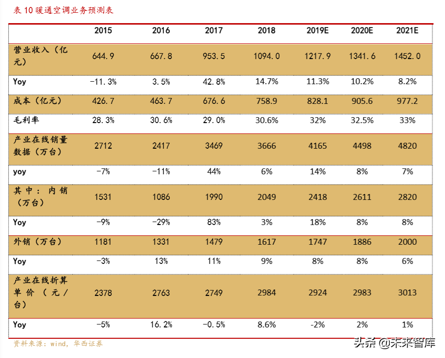 在暖通空调业务层面,美的格力双寡头格局稳固,虽然月份间受到价格及竞争态 势的转变出现市占率的短期变化,但长期格局趋势稳定。目前我国空调行业处于成熟 阶段,美的未来空调业务的增长空间来源于乡镇市场的下沉、电商渠道的快速增长、 海外市场的布局和产品高端化升级带来的增长点。2019 年以来美的空调单价有所下 滑,但销售量增速较快,同时成本红利带来毛利率水平的提升,因此我们预计内销市 场 2019 年增速较快。