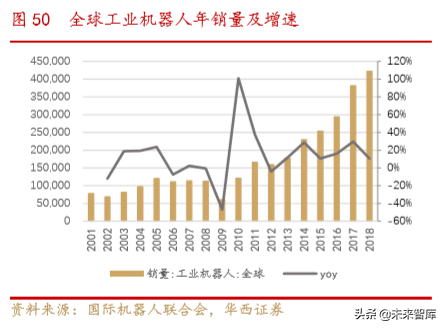 全球工业机器人规模提升,制造业升级下市场需求广阔。根据国际机器人联合 会的数据,全球工业机器人的销量在 2010 年实现高速增长,2010 年全球工业机器人 销量增速 101%,销售额增速 50%,2013-2018 年间全球工业机器人销量和销售额增速 处于 10%-30%之间。在全球人口老龄化、劳动力成本提高及制造业转型升级的背景下, 工业机器人市场需求有望长期保持增长。