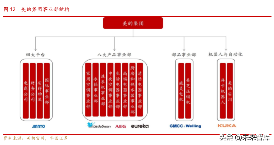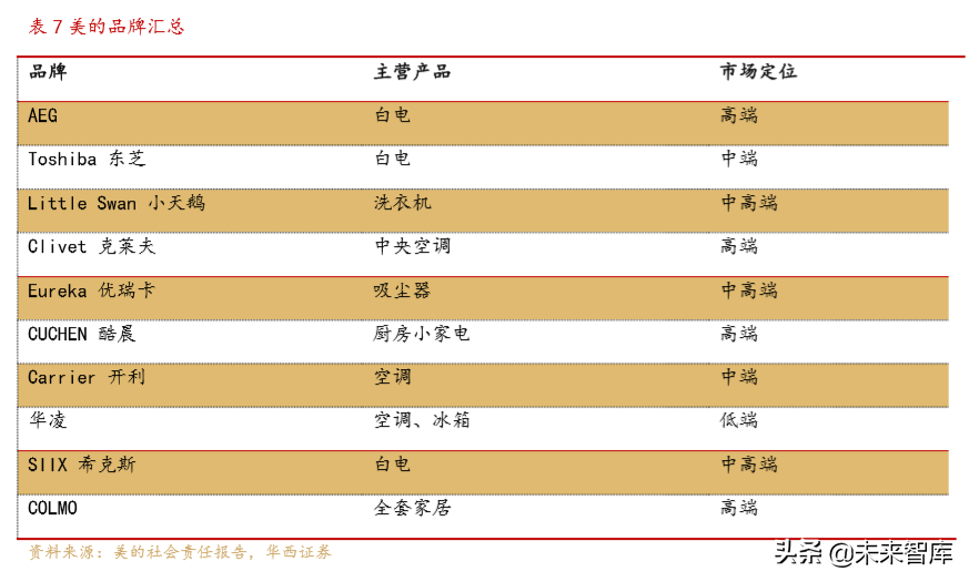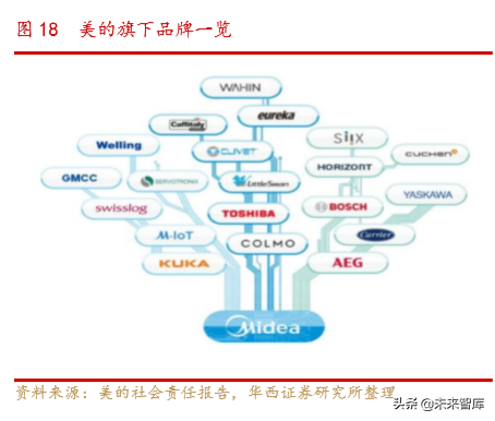早期美的收购集中在品类扩充,全方位切入白电+小家电领域,伴随品类的不断 完善,美的收购标的逐渐聚焦于品牌的拔高与产品结构的升级。近年来公司品牌收购 节奏加快,2016 年与韩国酷晨合作拓展全球高端生活家电市场;同年与日本东芝完 成股权交割,买下欧洲老牌家电巨头伊莱克斯吸尘器品牌 EUREKA,启动对东芝白电、 意大利中央空调企业 Clivet 的收购;2017 年 5 月宣布与伊莱克斯共同出资成立合资 公司引入 AEG 品牌进军高端厨电领域。近年来通过一系列海内外的收购兼并,美的集 团旗下拥有美的、小天鹅、华凌、威灵、安得、COLMO、GMCC、Eureka、TOSHIBA(品 牌授权)等十余个国内外知名品牌。