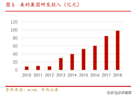 在产品领先层面,美的持续加大研发投入和产品开发,聚焦研发创新,以科技创 新驱动发展。2011 年成立制冷研究院,2012 年与东芝开利共建“美的—东芝开利变 频技术联合研发中心”,2014 年起美的筹建中央研究院、智慧家居研究院。目前美的 集团以中央研究院为核心,完善事业部四级研发体系,关注先行研究体系构建,布局 中长期技术储备。从研发费用来看,2012 年公司研发支出 9.31 亿元,占营收比重仅 0.9%,2015 年公司研发支出达到 52.63 亿元,占营收比重达到 3.8%。