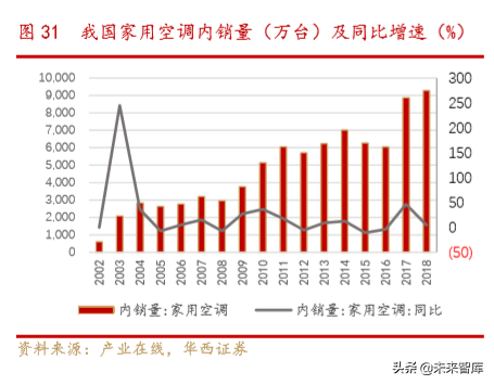 看成长:内销市场处于成熟阶段,消费升级下产品更新换代与一户多机趋势驱 动内销增长。我国空调行业自家庭保有量和普及度提升后,行业增速出现放缓现象, “家电下乡”、“以旧换新”、“节能惠民”等政策进一步刺激了市场需求推动了行业增 长。家用空调行业内销量自 2008 年回落后,2009 年和 2010 年内销量增速达到 27%和 37%。2015 年受到凉夏天气影响以及前期渠道加库存,家用空调内销量同比下滑 10.66%。2016 年空调内销市场开始回暖,2017 年受高温天气和房地产需求的拉动, 家用空调内销量同比增长 47%。我国内销市场已处于成熟阶段,未来行业成长空间主 要来自于消费升级下产品的更新换代和一户多机趋势下内销市场的增长。