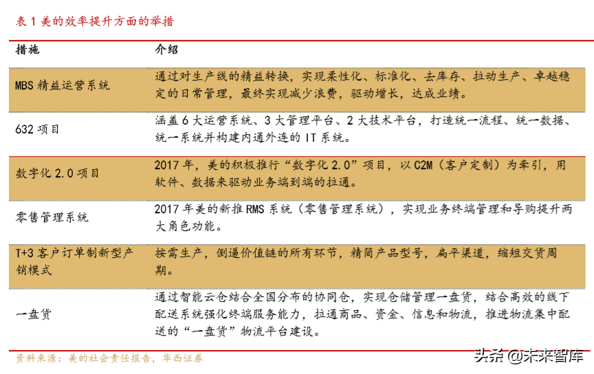 在效率驱动层面,美的在制造效率、资源效率、自动化信息化等方面进行了提升。 MBS 精益营运系统通过对生产线的精益转换提高制造效率;T+3 客户订单制的推进以 客户为导向,快速满足市场需求,实现去库存;数字化 2.0 项目以数字化赋能全价值 链经营管理,通过营销 CCS 系统,美云销新系统,RMS 零售管理系统作为内销三大基 础管理系统,覆盖全渠道、终端门店信息管理,打通出货、分销与零售,实现业务全 程在线化,信息可视化,提升效率。