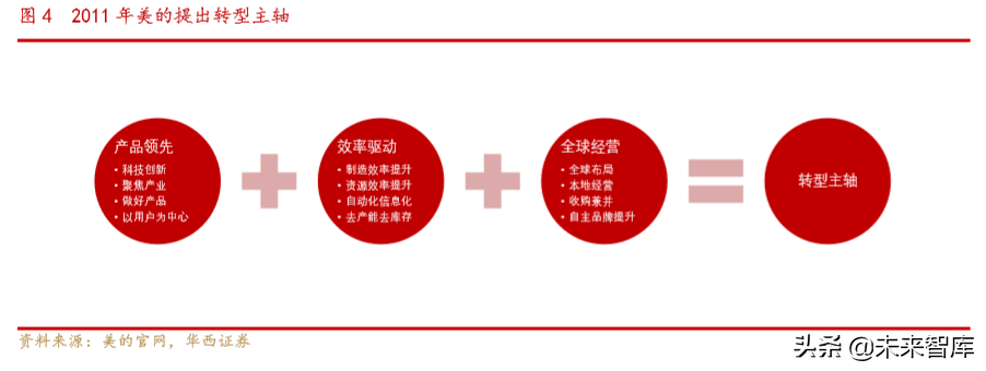 在已有生产运营效率提升到一定高度后,美的提出“智慧家居、智能制造”双智 战略,寻找业务新增长点。2015 年美的在“产品领先、效率驱动、全球经营”三大 主轴上聚焦“智慧家居+智能制造”的双智战略。