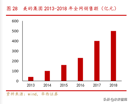 电商渠道的兴起带来渠道变革,成为传统渠道的有利互补。美的对电商渠道的 管控可以分为三个阶段,2008 年开始公司发展电子商务,2014 年美的集团成立电子 商务公司,开设天猫美的全品类官方综合旗舰店,开启美的官方商城运营模式,实现 从网上销售模式到面向用户交互式的 O2O 模式的转变。2017 年,美的集团线上销售 突破 400 亿元,同比增长 80%,全网排名第一。2018 年,美的集团线上销售超 500 亿元,同比增长超过 22%,蝉联全网排名第一名。2019 年上半年,美的全网销售超过 320 亿元,同比增幅达到 30%以上,在京东、天猫、苏宁易购等主流电商平台保持家 电全品类第一的行业地位。