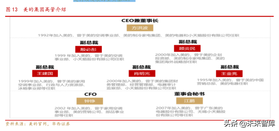 职业经理人管理体制完善治理架构、企业管控和集权、分权体系的建设。2012 年,美的集团创始人何享健退位,将董事长一职禅让给职业经理人方洪波,自此,美 的集团已完全由职业经理人团队掌舵。通过集权体系、分权机制、内部提拔原则、激 励机制和问责机制,逐步形成成熟的职业经理人管理体系。公司的高层经营管理团队, 均为在美的经营实践中培养的职业经理人,在美的各单位工作年限平均达 15 年以上, 熟悉企业文化及公司运营模式,具备丰富的行业知识和管理经验,对产业运营环境及 企业运营管理有精准的把握。成熟、专业、高效的管理模式,奠定了美的长久依赖稳 定持续发展的坚实基础。