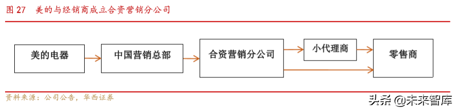 国美事件后家电厂商进行渠道改革,建立地方营销公司体制。2004 年由于空调 销量下滑、大型连锁卖场的门店及营销费用较高导致大型零售商的单店收益下滑,在 此背景下,家电连锁卖场试图将成本转嫁给厂商。2004 年国美将格力空调大幅降价 销售去库存,破坏了格力空调长期稳定、统一的价格体系。国美与格力在空调销售政 策上未能达成共识导致合作破裂,此后格力开始渠道变革。此次事件也给了其它空调 厂商对渠道管控力方面的思考,美的开始成立合资销售公司。经过多次改革后,美的 经销商与美的分公司合资成立营销分公司,中间环节得以打破,层级环节缩减。