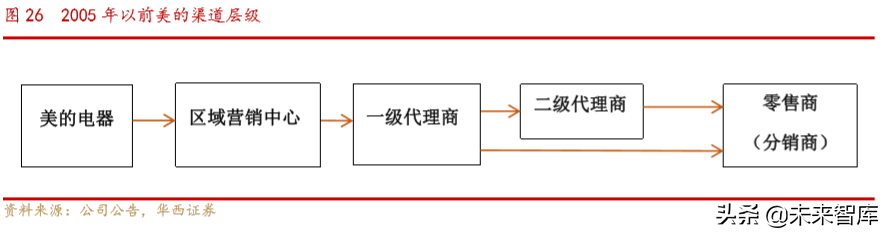 传统行销模式便于渠道通路的打开和覆盖。在 2005 年以前,美的集团下设两级 代理商,公司将产品销售给一级代理商,再由一级代理商销售给二级代理商和分销商, 由此进行渠道网络的覆盖和下沉。一级代理商负责分销渠道的开拓、铺货、物流、仓 储,帮助公司覆盖 KA、专卖店等传统销售渠道,而公司并不直接覆盖销售渠道。传 统行销模式下公司可以依靠代理商的资源迅速进入终端渠道,便于产品的铺货和推广, 但代理商的利润空间下,对上游的议价能力强。