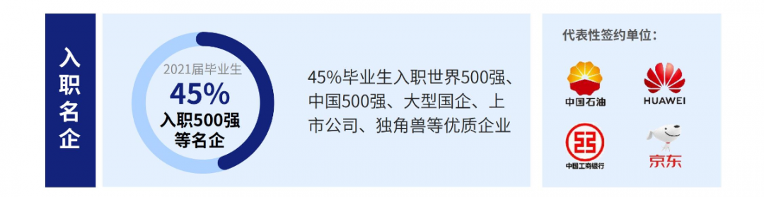 2021届毕业生中,45%入职以华为、京东、国家电网、中铁集团、国有四大银行为代表的500强、大型国企、上市公司等优质名企。