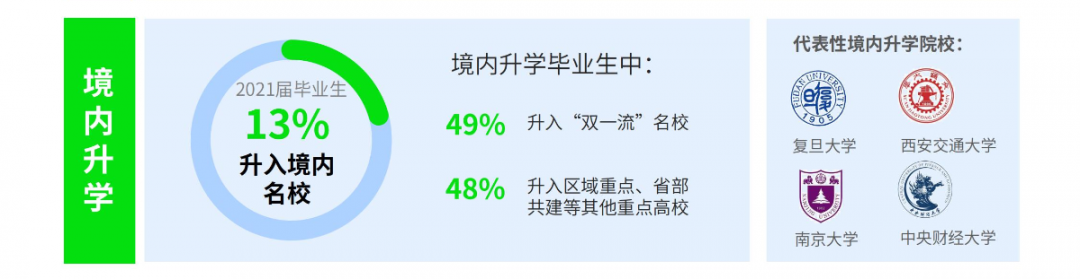 ◆ 毕业生境内升学情况良好,约一半升入“双一流”名校