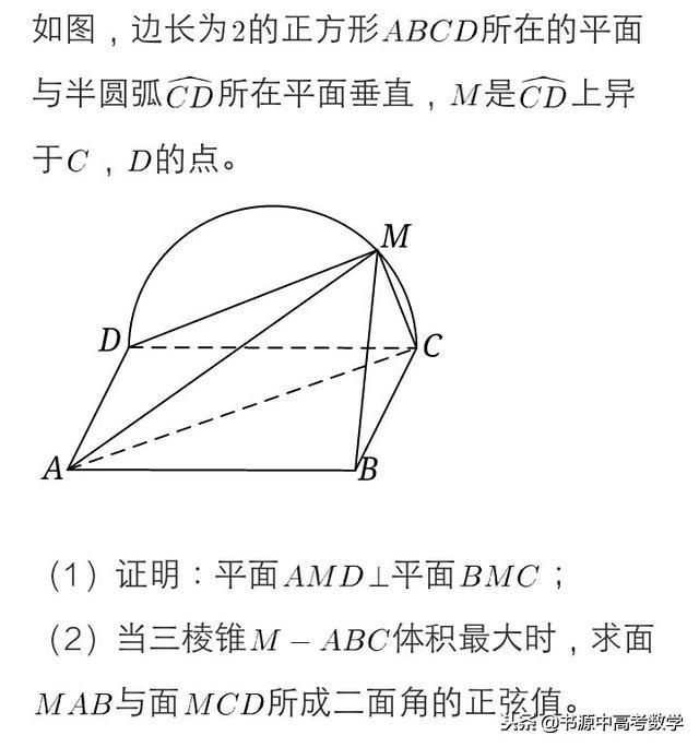 (2)建立空间直角坐标系,当M是CD弧的中点时,几何体体积最大,写出各点的坐标,利用法向量的夹角求解即可。