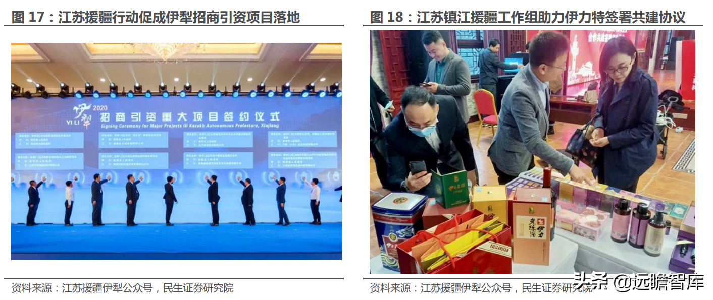 近年来,国家为推进新疆跨越式发展及长治久安作出加强推进对口援疆工作战略部署,干部人才援疆是新疆工作的重要组成部分,其中江苏对口援建公司所在地伊犁州,先后输送 302 名援疆干部,重视干部人才援疆工作。江苏援疆伊犁共为伊犁州签约招商引资及意向项目 84 个,协议引资 340 多亿元。公司 2022 年计划以援疆干部为切入点,以伊力王为主力产品,重点打造江苏样板市场。通过援疆人才资源带动与公司内部规划布局相协同开拓疆外市场,以官员回乡消费影响力拉动伊力特出疆行动。