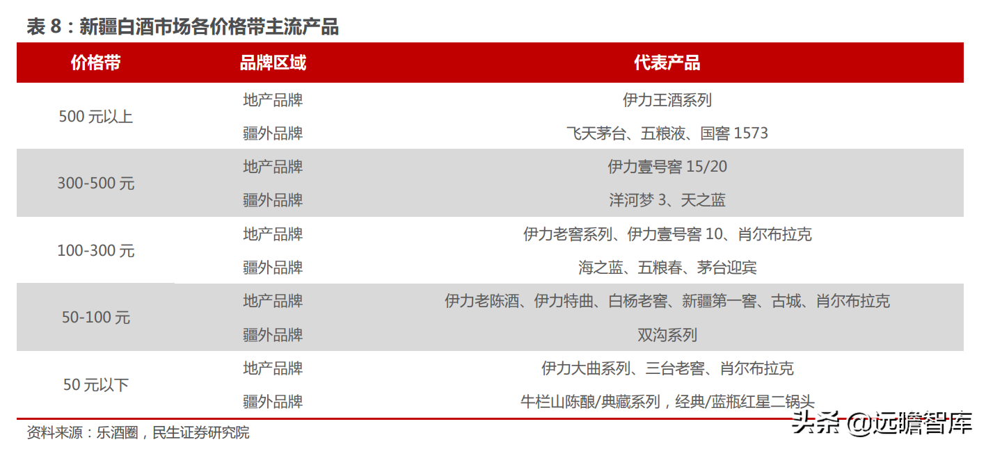 随着新疆经济快速稳定发展,宏观经济环境整体向好,白酒主流价格带分布从低端、中端不 断提升。预计未来疆内白酒行业价格带会随着消费升级而逐渐提升,白酒市场有望进一步扩容;在消费升级与政策驱动下,次高端将成为新疆白酒未来的主要增长点。