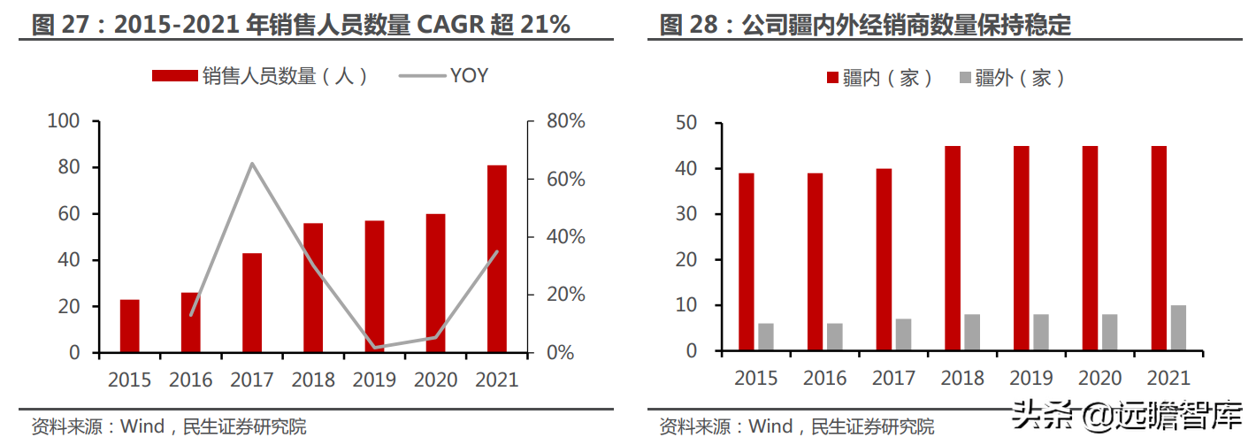 近年来公司转变扩张思路,由依赖大商模式转变为注重小商培育和渠道深耕模式,进行渠道下沉扁平化招商,通过品鉴会、门头建设等方式精细化培育疆外市场。未来公司有望通过援疆干部资源和地缘优势两条路径实现疆外市场拓展,摆脱疆内白酒消费规模局限性。