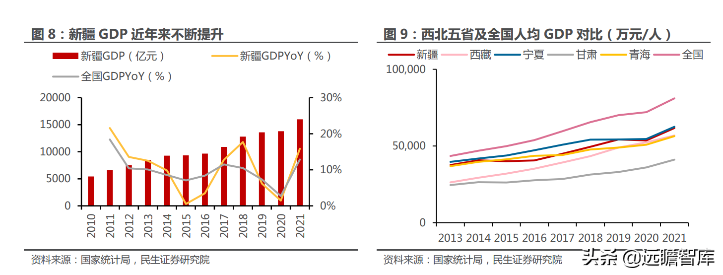 区域宏观经济稳步增长,增速高于全国平均水平。新疆自治区位于我国西北边陲,外接蒙古、俄罗斯等 8 国,地广人稀,经济体量较小。近十余年新疆宏观经济发展经历了三大阶段: