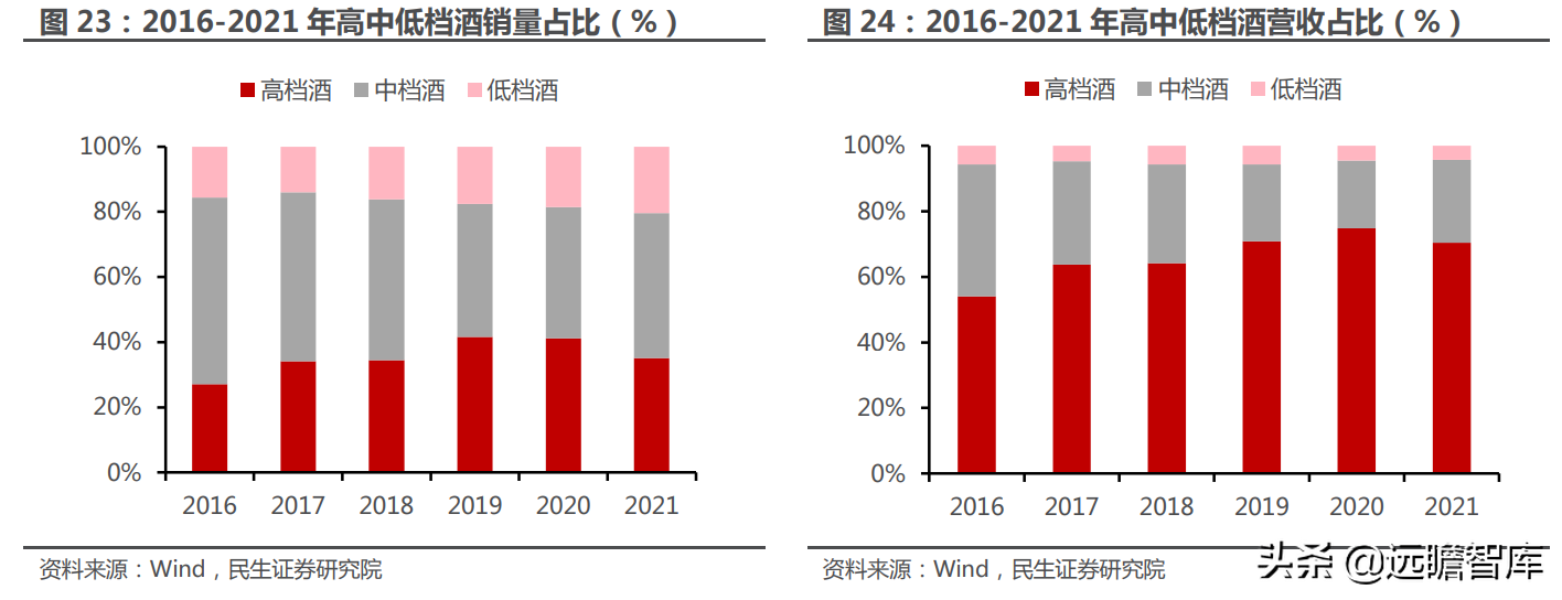 截止 2021 年,公司高端酒营收占比由 16 年 54.1%提升至 70.4%,销量占比由 27.1%提升至 35.2%,高端酒占比提升明显,同期中档酒收缩明显,而低档酒占比则略有下滑。