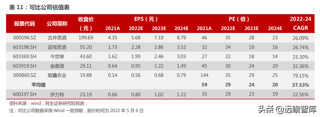 我们选取区域型酒企或产品价格带与公司相当的白酒企业,采用 wind 一致预期,可比公司 2022-2024 年平均估值约 29、24、19 倍,考虑公司未来高端产品占比有望持续提升,且疆外扩张有望加速,公司估值水平略低于平均,我们认为未来其估值仍具备向上空间。