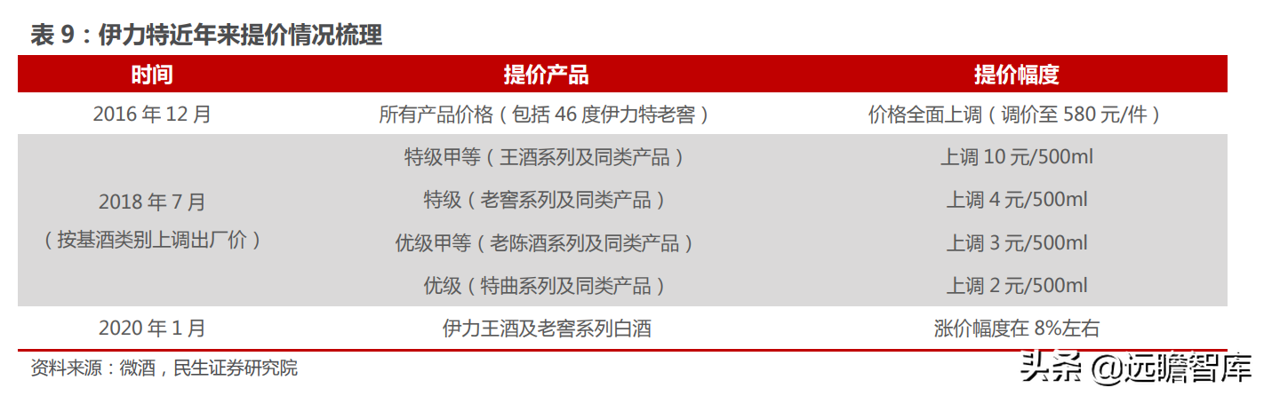 区位龙头优势加码,产品提价具备广阔空间。新疆地处偏远,人口构成相对复杂,整体白酒市场的竞争烈度不高,因而龙头酒企凭借地理位置优势有望在疆内实现快速扩容。伊力特作为疆内龙头酒企,具备较强的产品溢价能力,自 2016 年以来已经完成 3 次提价。