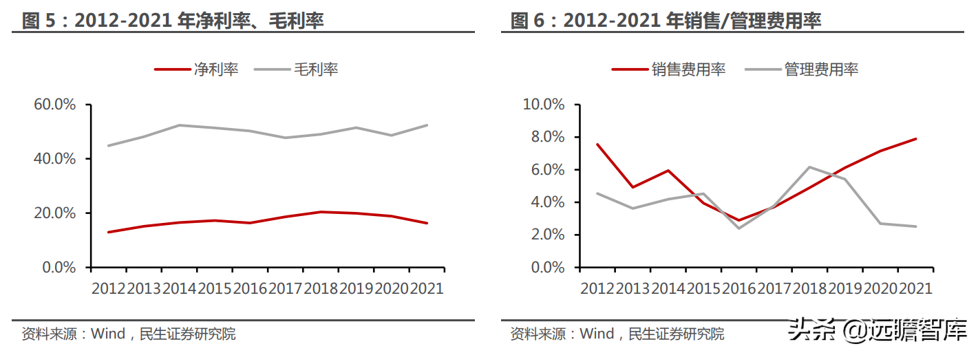 公司产品结构不断升级,受益于产品提价政策,17-19 年毛利率不断提升至 51.5%,20 年疫情影响导致毛利率有一定下滑,21 年受益于高端酒占比提升,毛利率回升至 52.3%。同时,公司不断发力渠道投放及品宣营销,加大广告投放、促销费用及销售人员薪酬开支,销售费用率持续提高。