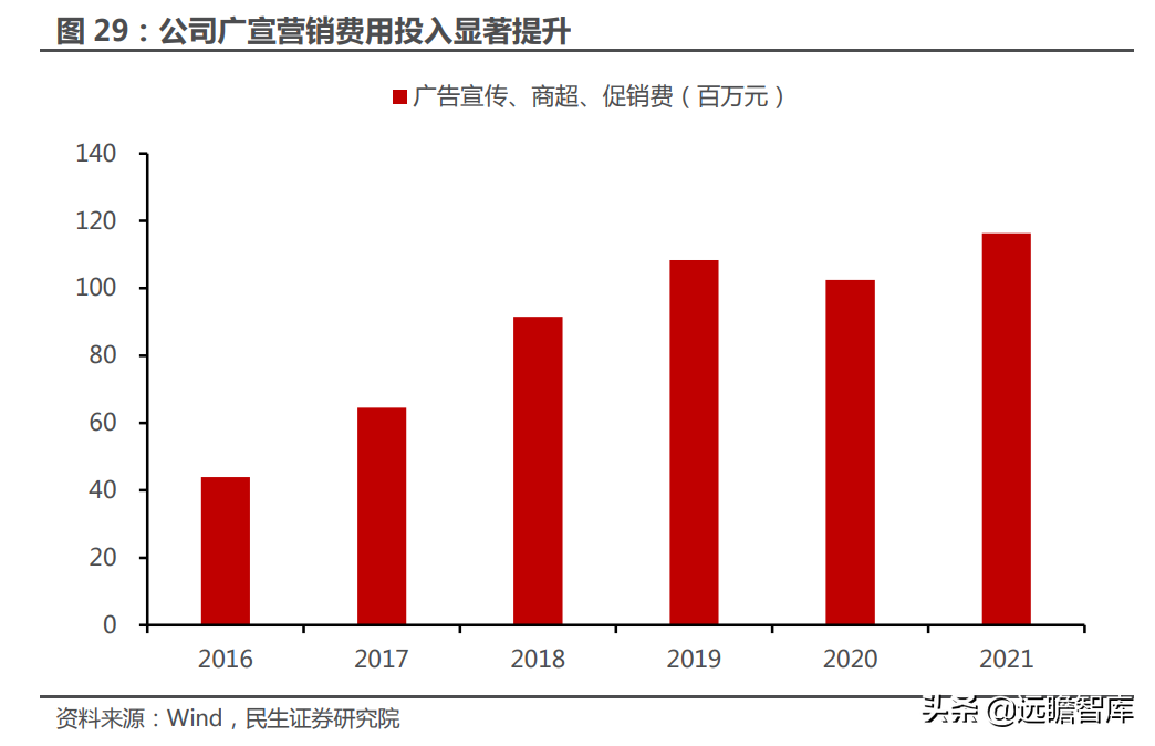 公司一改只收不投的营销方式,不断加大对高铁、机场广告、广汇男篮等终端品牌建设投入,广告宣传推广费用显著提升。伊力王产品广告于 2022 年 1 月 10 日起登陆央视军事频道 CCTV-7,分别在新闻联播、国防军事早报、防务新观察等栏目前后占据黄金时段轮番播出,符合公司“英雄本色”的品牌定位,不断扩大品牌影响力与知名度。同时通过“为伊力特喝彩”抖音挑战赛促销活动, CBA 球员抖音直播、抖音官方账号《平凡英雄》、《英雄本色》、《热血英雄》致敬军人剧集等方式投入线上营销。