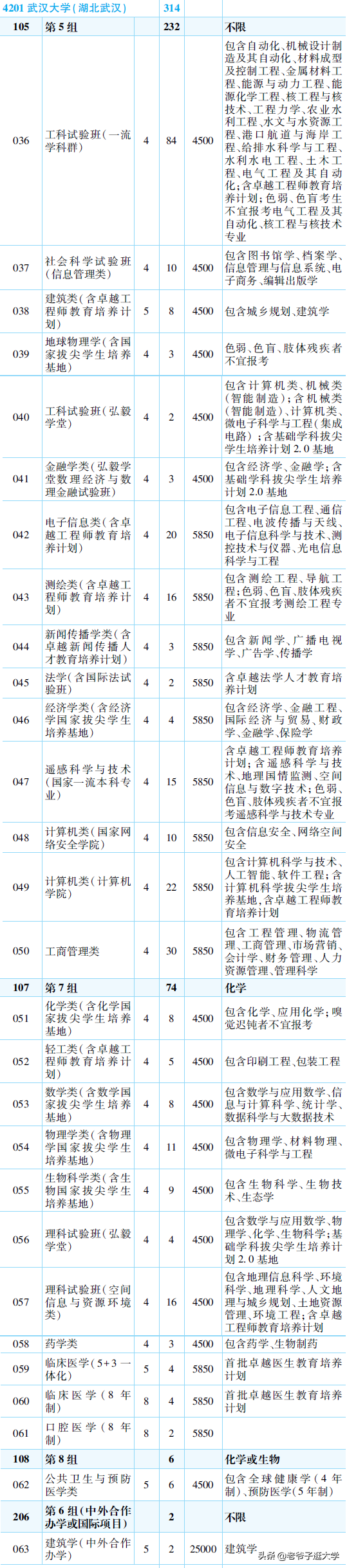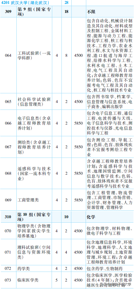 口腔医学8年制,计划2人。录取分数为642-650。临床医学8年制,计划4人。录取分数为653-656。理科弘毅班,计划4人,分流的专业包数学、物理、化学、生物专业,本研连读。录取分数为648-659。数学类,计划8人,分流的专业包含了数学、应用数学、统计学、大数据专业。录取分数为637-647。临床医学5+3一体化,计划4人。录取分数为634-634。药学类,计划3人,分流的专业包含了药学、生物制药专业。录取分数为634-635。化学类,计划8人,分流的专业包含了化学、应用化学专业,有体检要求。录取分数为634-639。物理类,计划11人,分流的专业包含了物理、微电子专业。录取分数为635-646。生物类,计划9人,分流的专业包含了生物、生态专业。录取分数为637-648。地理类,计划16人,分流的专业包含了地理信息、城乡规划、环境专业。录取分数为634-643。轻工类,计划4人,分流的专业包含了印刷、包装专业。这个专业组涵盖了武汉大学的理科和医学,冷热搭配。热门专业有口腔8年制、临床8年制、5+3一体化、理科弘毅班等,冷门专业有地理、轻工等,全省前1200名的考生才能录取到本研连读班。
