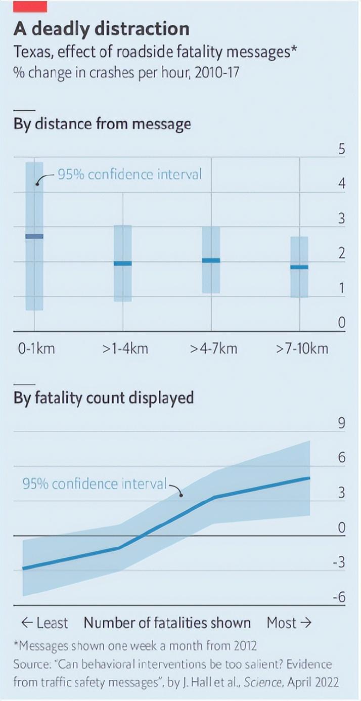 The study focused on Texas, where the year’s cumulative death toll from road accidents was displayed on highway signs one week in four. The authors found that, between 2010 and 2017, there were more accidents in the weeks when death counts were shown. Most excess crashes happened in the kilometre after a sign, but for several kilometres there was still an elevated risk (see top chart). In the 10km after a message there was a 4.5% rise in accidents—some 2,600 extra crashes and 16 deaths each year in Texas.
