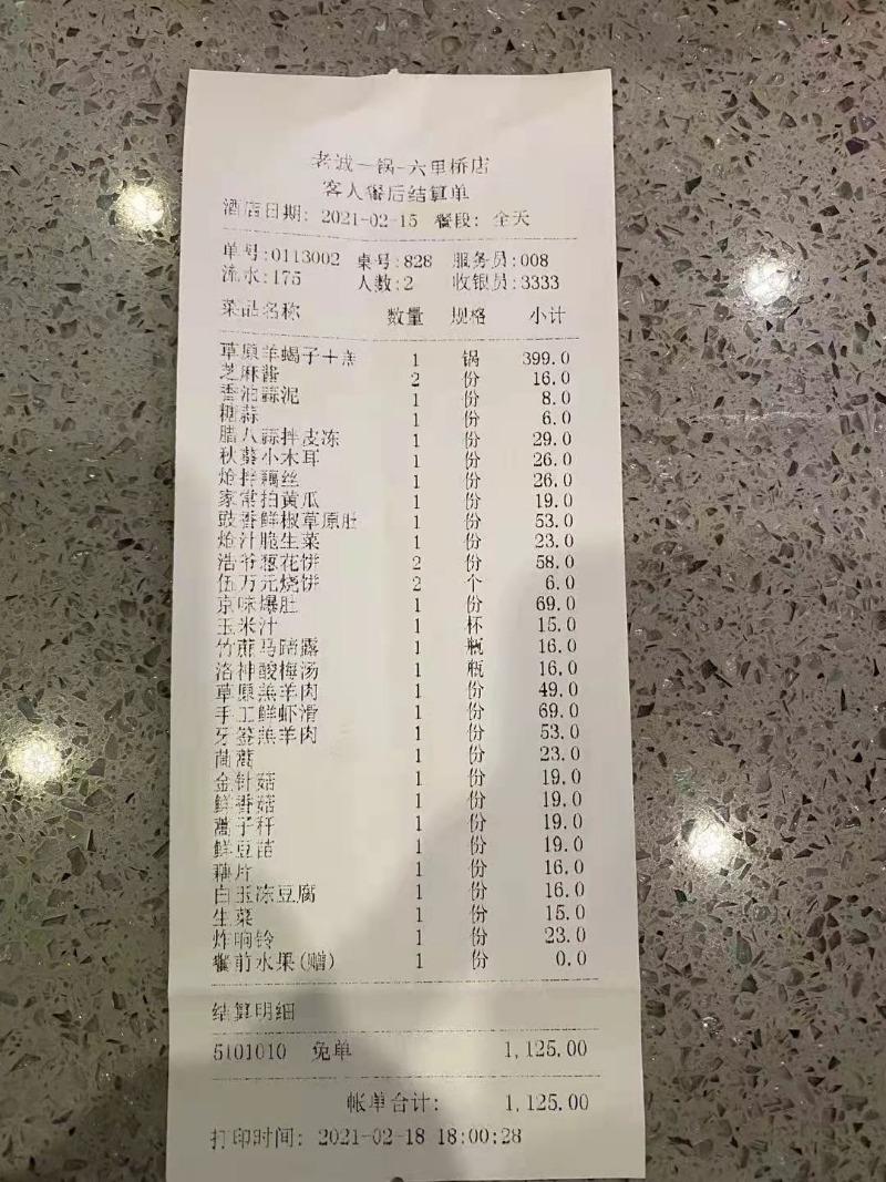 蔡超杰介绍,两个人一共点了20多种涮品和凉菜,总计1125元。事发时,这些菜很多都没有动。当时,餐厅对顾客进行了赔礼道歉,并进行了免单处理,还将顾客没动的菜品打了包。但是,顾客并没有将打包的菜品带走。
