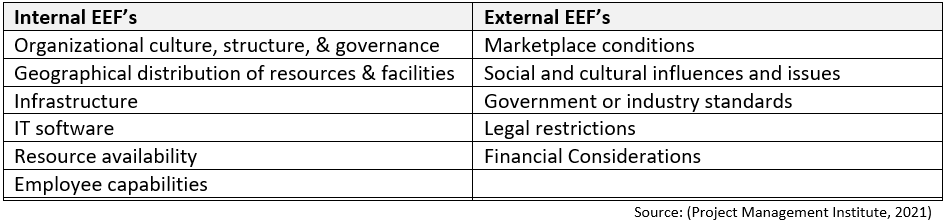 总之,EEF 是项目团队控制之外的环境因素,既有内部因素,也有外部因素,对项目结果既有积极的影响,也有消极的影响。通过战略性地考虑 EEF 在项目管理中的作用,成功完成一个项目的机会增加了。