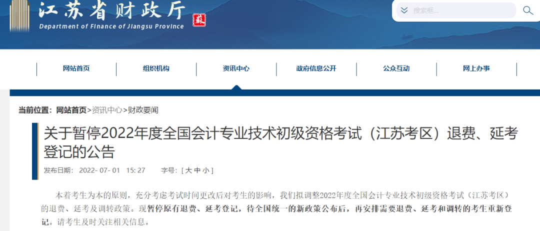 本着考生为本的原则,充分考虑考试时间更改后对考生的影响,我们拟调整2022年度全国会计专业技术初级资格考试(江苏考区)的退费、延考及调转政策。现暂停原有退费、延考登记,待全国统一的新政策公布后,再安排需要退费、延考和调转的考生重新登记。请考生及时关注相关信息。