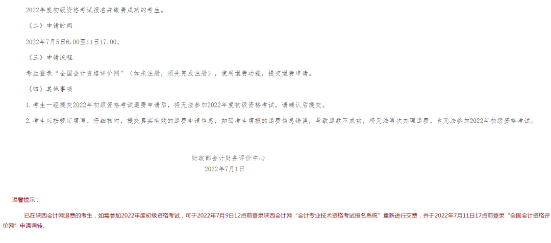 已经完成退费的考生,还想参加2022年度初级资格考试,可于2022年7月9日12点前登录陕西会计网“会计专业技术资格考试报名系统”重新进行交费,并于2022年7月11日17点前登录“全国会计资格评价网”申请调转。