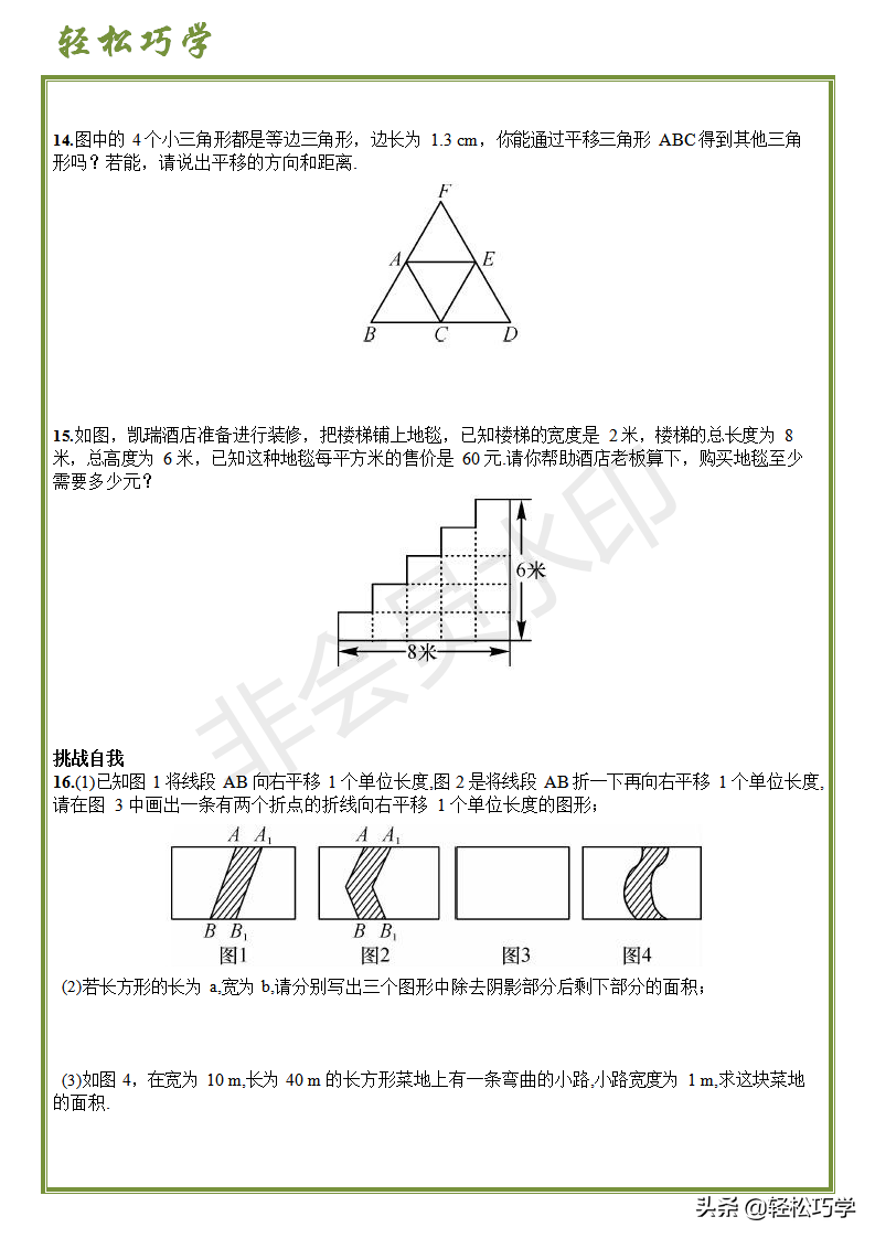 12. 图中的4 个小三角形都是等边三角形,边长为1.3 cm,你能通过平移三角形ABC 得到其他三角形吗?若能,请说出平移的方向和距离.