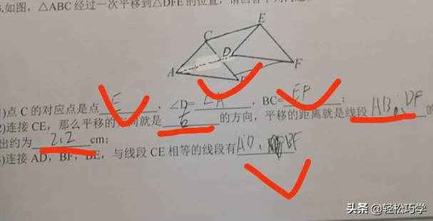(2) 连接 CE,那么平移的方向就是 的方向,平移的距离就是线段 的长度,可量出约为 cm;
