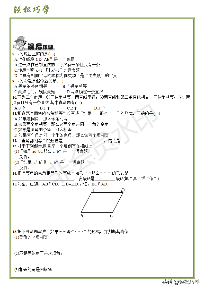 (3)如果两个角相等,那么这两个角是内错角.是假命题.