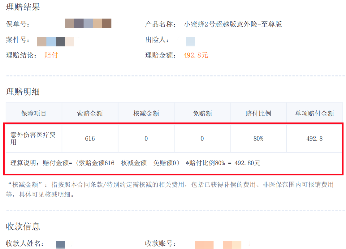 发票金额616元,因社保无法报销,所以按照80%比例赔付,到账金额492.8元。