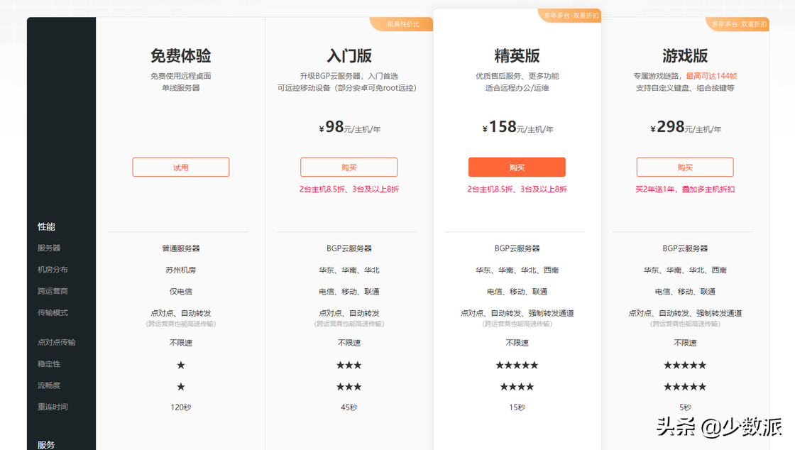 例如向日葵就针对不同的账户提供了不同等级的连接质量选择,对于免费账户,其转发服务器只有位于苏州的电信机房,付费的账户可以使用 BGP 云服务器机房。在一些需要使用转发服务器的远程连接场景下,使用免费账户进行远程会出现明显的卡顿和延迟,对应的还有桌面画质的降低。如果你使用远程控制串流游戏,可以想想会是什么样的体验。