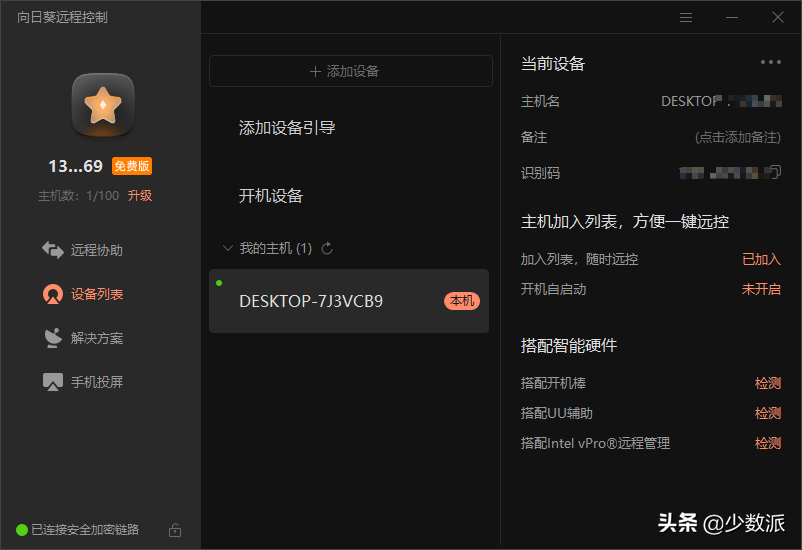 此外针对企业内批量控制设备的需求场景,一些远控服务需要独立的被控客户端来满足批量控制的需求,通过批量的将被控端加入到同一账户下的客户端列表中——只需要安装被控客户端,就可以在主控端通过设备列表实现「无感」的无人值守远控。