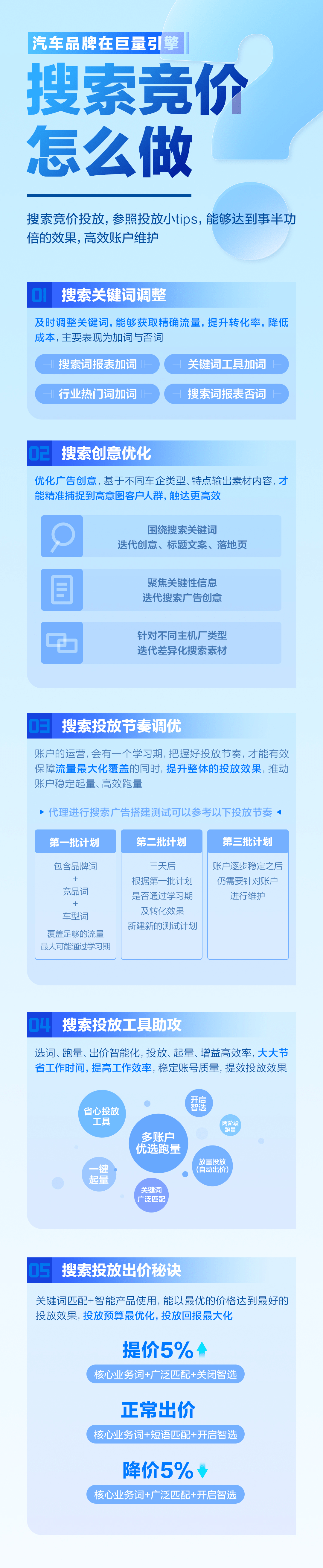 从产品本身来看,巨量引擎搜索竞价的上手难度不高,可以通过搜索关键词调整、搜索创意优化、搜索投放节奏调优、搜索投放工具助攻、搜索投放出价秘诀的“五步法”快速上手。真正的差异是在汽车品牌熟练运用“五步法”后——他们能结合巨量引擎的内容生态,找到更多进阶玩法,带来超预期的收益。