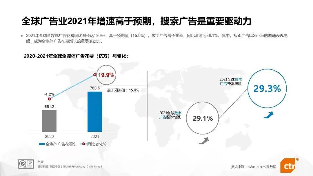 相较于其它营销方式,搜索营销的本质是连接来自消费者的主动沟通意愿,对于已经完成品牌种草,准备试驾购买的消费者能起到事半功倍的作用。在信息大爆炸时代,“搜索”是人们将模糊信息不断对焦变为己用的关键一环。尤其是在营销方面,虽然品牌广告、KOL有很强的决策引导能力,但很多人还是倾向于摄取大量外部信息后,通过搜索来“一锤定音”。据CTR央视研究院《2022年搜索营销预算趋势报告》,2021年搜索广告成为全球广告花费增长的“主力”之一,预算增速高达29.3%。