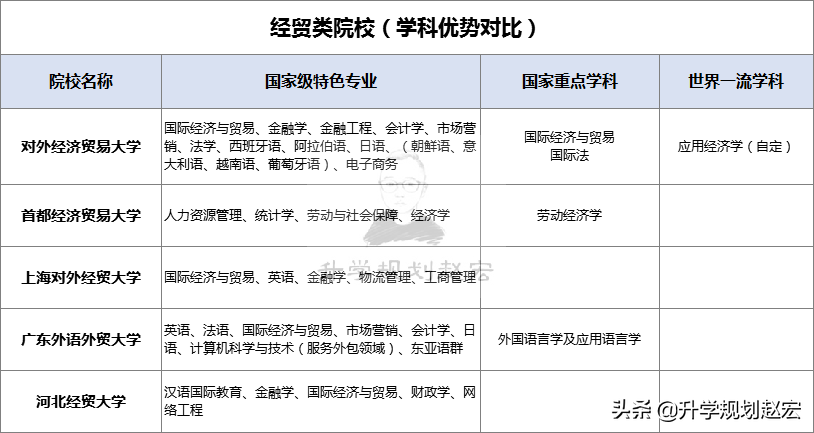 经贸类的财经院校,重点在贸易这一块,相关的语言也不非常不错,除此之外,法学也是很有特色,根据实际情况来选择,看未来需求去选择。综合类、财经类、语言类和法学类院校去结合选择;欢迎关注@升学规划赵宏 ,分享高考院校、专业、志愿填报相关知识;#学浪计划#