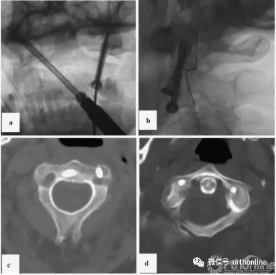 在双平面x线引导下,将K-wire穿过C2椎体下边缘并插入寰椎对侧侧块(图3a),并用其钻通骨隧道。在骨隧道中插如一根空心皮质内固定螺钉(直径4mm,长度38mm),螺钉头在C2椎体的位置有利于左侧关节的Reindl固定。然而,C2双侧侧块明显变薄(CT数据;图1,右)使得我们无法实施这种方法。