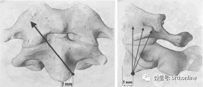 迄今已有数种可用的不同的螺钉置钉轨迹的报道[2,4,6]。生物力学研究表明,该种技术具有足够的固定强度,可与后路融合技术相媲美[3,5]。未见手术相关的并发症的文献报道。对侧螺钉固定技术允许将螺钉放置在比皮质层深2-3毫米的C2椎体内,而Reindl[2]和Koller[4]所描述的技术将螺钉在大范围皮质下置入。在C2椎体内更深的位置的螺钉可能更加稳定,然而,这一结论还没有被生物力学研究证实。