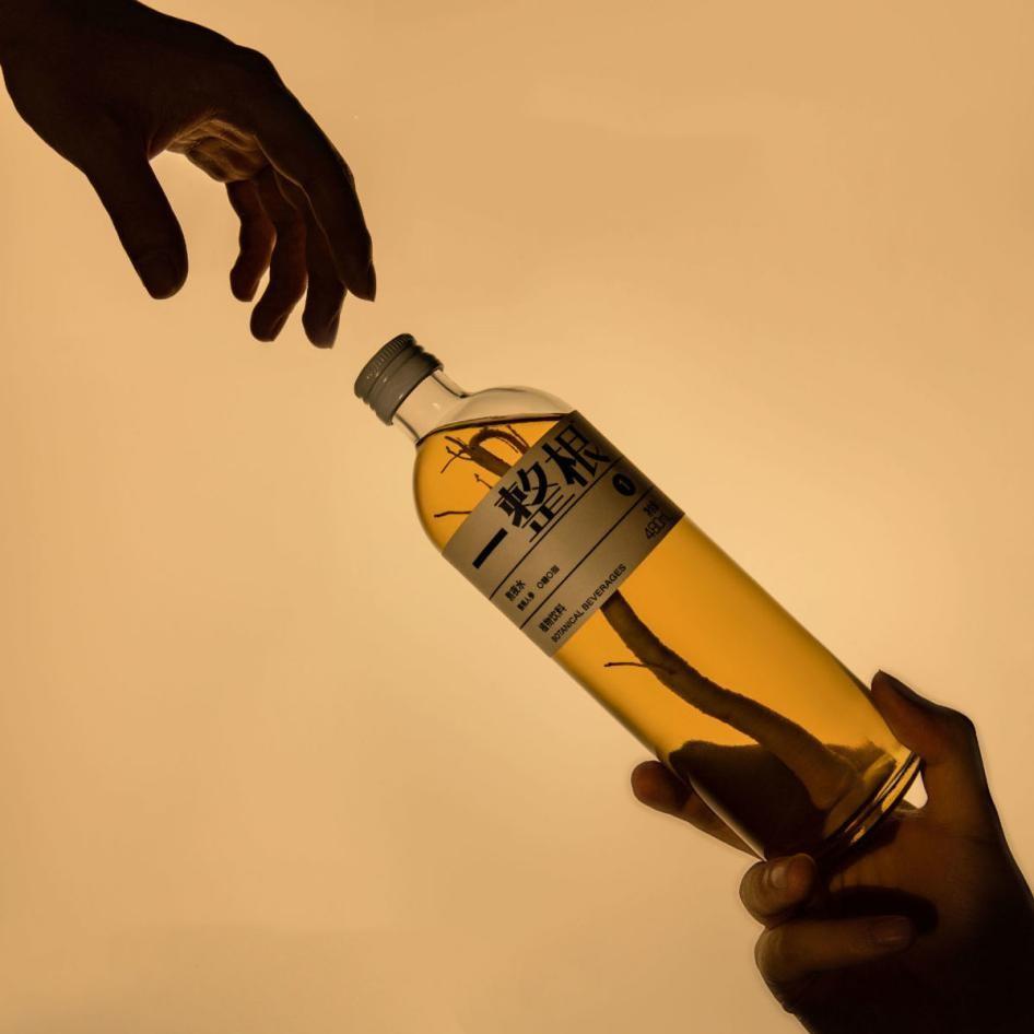 我们再来看看“一整根人参水”产品形象“硬核”的产品形象。透明的玻璃瓶里面只装一整只1.3克的人参,量化的材料和原生态的呈现方式,只需一眼就能够给人留下深刻印象。