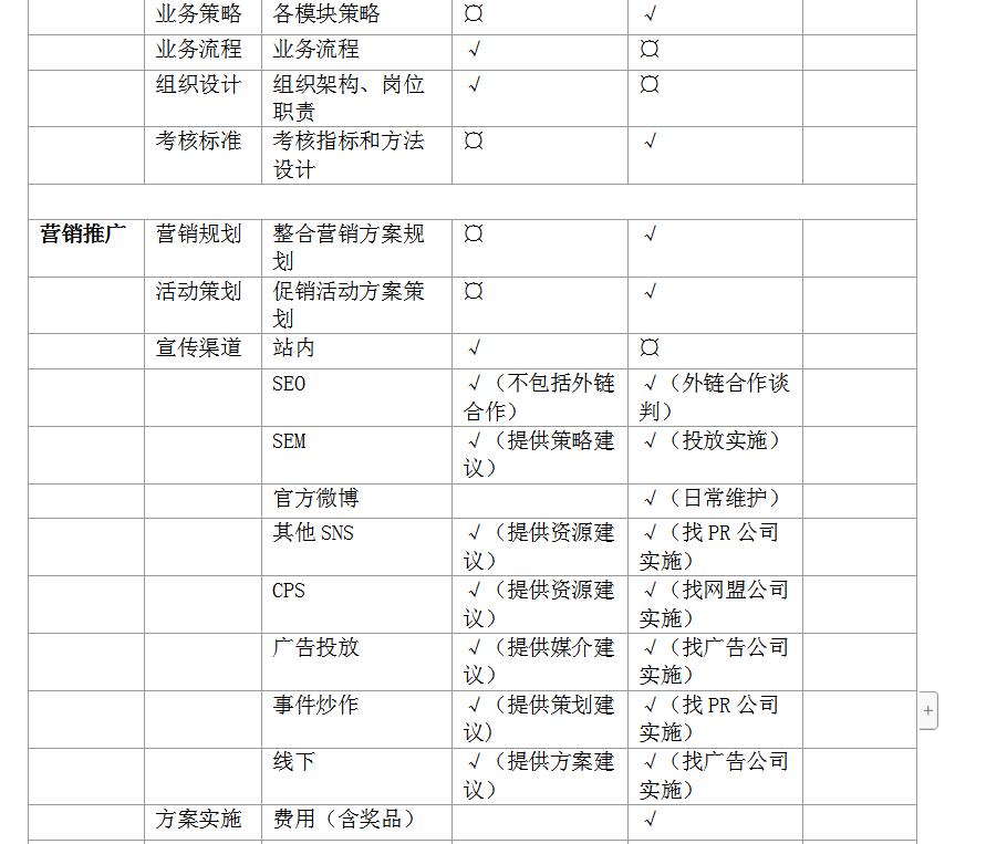 (3)平台经营模式方案:给出一套可执行可操作的本平台经营模式方案,包括本平台的营销推广方式、每季度促销方案、每年的平台购物节等,另外在入驻时广告费等推广费用以及可以获取企业效益的对比数据等,简单明了,抓住企业的眼球。